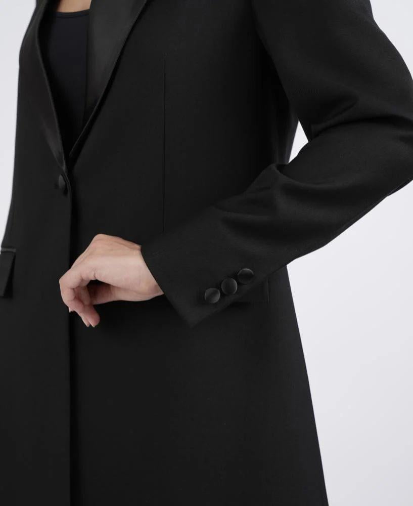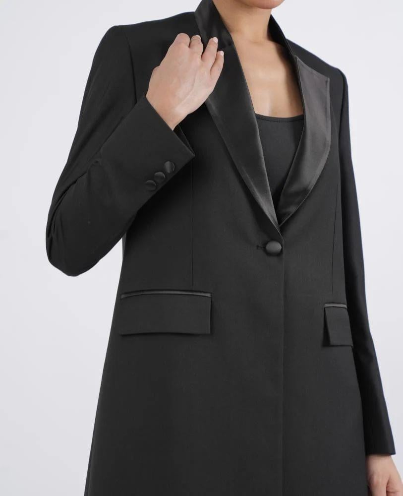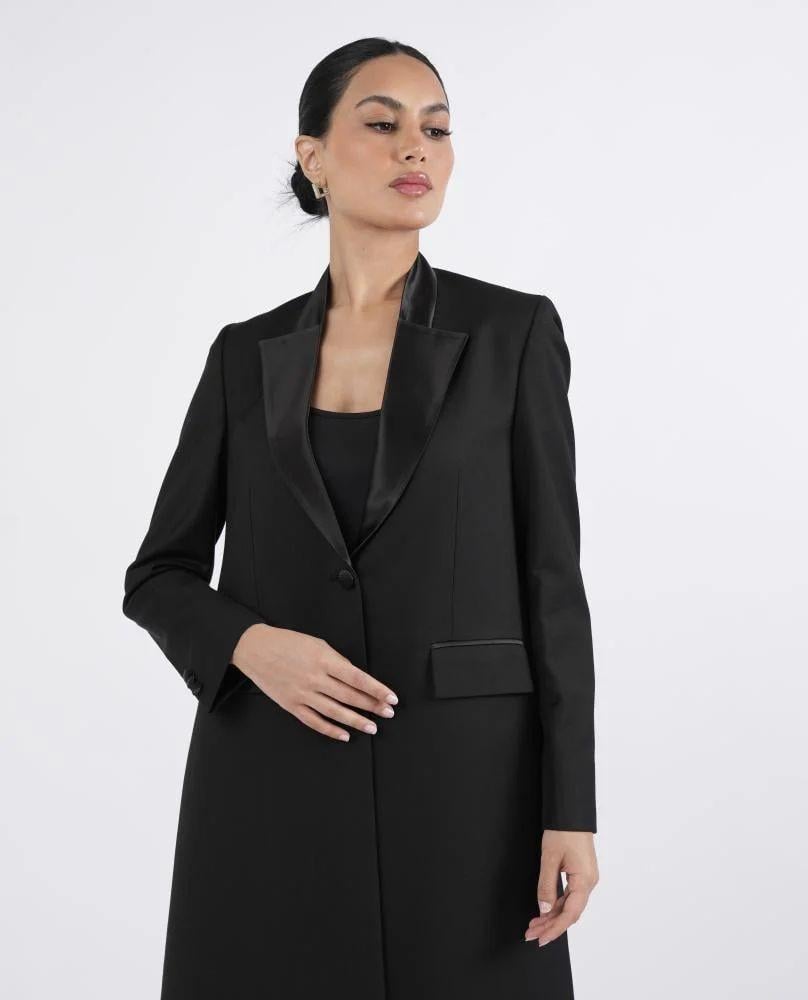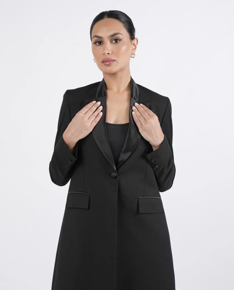 عباية بليزر سوداء راقية مصممة من كتان طبيعي فخم، مع تداخلات ساتان تضيف عمقًا ولمسة مميزة للتصميم. الكتافات تمنح البليزر هيكلية تُبرز القوام بثقة، مع قصة A-Line تمنح انسيابية ورقي✨